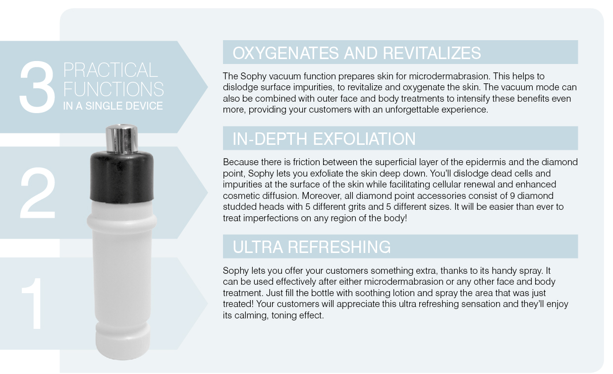 The Sophy diamond-tipped microdermabrasion unit combines high-performance technology with portability in one compact, versatile system. Sophy is easy to use and install and lets you perform microdermabrasion treatments simply and efficiently. Sophy can be used on both the face and body to visibly reduce the appearance of: