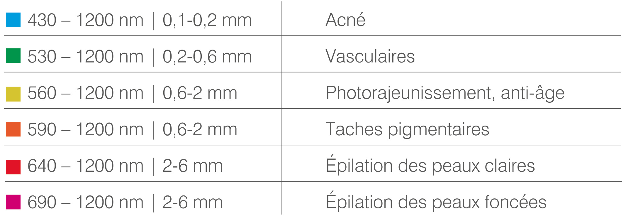 | 6 types de traitements possibles :photoépilation, photorajeunissement, rides, vasculaire, pigmentaire et acné Programmes prédéfinis pour les femmes et les hommes faciles à utiliser Réglages personnalisés également disponibles PUISSANCE Jusqu’à 50 joules/cm2 (40 joules/cm2 au Canada/USA) De 1 à 15 micro-impulsions par flash Jusqu’à 90 000 flashs par pièce à main (60 000 sous garantie) SÉCURITÉ OPTIMISÉE Alternance d’impulsions avec délai de relaxation Refroidissement à l’eau et thermoélectrique 2 fois plus efficace, allant jusqu’à -4 °C 5 niveaux de réglages de refroidissement Activation sécuritaire du flash via action combinée (pédale et pièce à main) | Légères, faciles à manipuler Connexion rapide sur le panneau avant de l’appareil Bouton d’activation et compteur de flash intégrés 2 pièces à main incluses au choix : - SHR 650-1200 nm pour photoépilation - SSR 560-1200 nm pour photorajeunissement - IPL à filtres interchangeables* * Filtres disponibles en option: - acné - vasculaire - photorajeunissement - pigmentaire - photoépilation - photoépilation peau foncée DESIGN PRATIQUE Écran couleur tactile de 8 pouces à réponse rapide Support pour pièces à main de chaque côté Panneau de rangement à l’arrière Facile d’entretien Système électronique indépendant Meilleure ventilation |