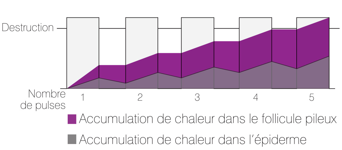 Contrairement à certains appareils qui n’émettent qu’un flash lumineux par application, la technologie APL permet de programmer une série d’impulsions lumineuses à alternance rapide lors d’un même flash. Cette fonction multiplie l’efficacité de chaque flash, tout en respectant le temps de relaxation thermique nécessaire à la peau. Des programmes précis sont également disponibles selon le phototype de la peau et la densité des poils à traiter, pour des traitements sécuritaires et confortables. Le délai de relaxation thermique de la peau est de 12 à 15 fois plus rapide que celui du poil. Cela signifie que le poil absorbe et retient la chaleur beaucoup plus longtemps que la peau. Par conséquent, en appliquant une série de micro-impulsions au cours d’un même flash, on favorise une accumulation progressive de chaleur dans le follicule pileux tout en laissant un temps de repos à la peau pour disperser cette chaleur et préserver les tissus environnants.